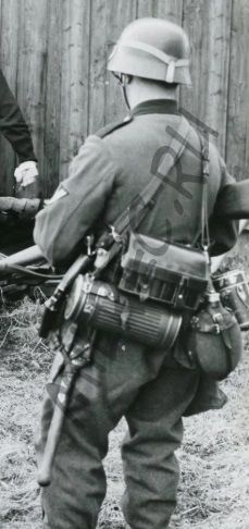Чехол для пехотной лопатки ( Taschefur kleines Schanzzeug ),иногда называемый коллекционерами чехлом «с закрытой спинкой», состоял из задней кожаной лопасти и переднего кожаного ободка. На верхнем крае чехла были две кожаные петли, в которые продевался поясной ремень. Кожаный удерживающий ремешок пришивался к правому краю переднего кожаного ободка, пряжка пришивалась к левому краю: когда лопатка вставлялась в чехол, удерживающий ремешок оборачивался вокруг ручки непосредственно под лезвием. Существовали образцы чехла без кожаной лопасти, с таким же ободком, как и спереди (коллекционеры называют такие модели чехлами «с открытой спинкой» или «скелетонизированными»).