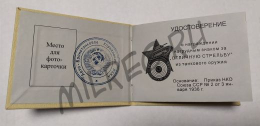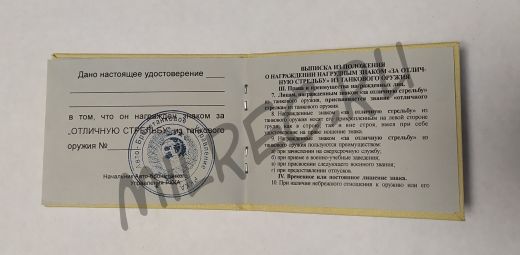 Удостоверение к нагрудному знаку "За отличную стрельбу из танкового оружия" (копия)